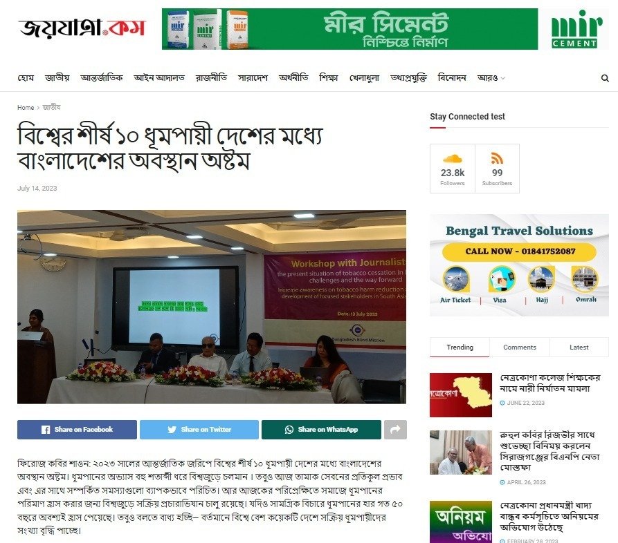 বিশ্বের শীর্ষ ১০ ধূমপায়ী দেশের মধ্যে বাংলাদেশের অবস্থান অষ্টম